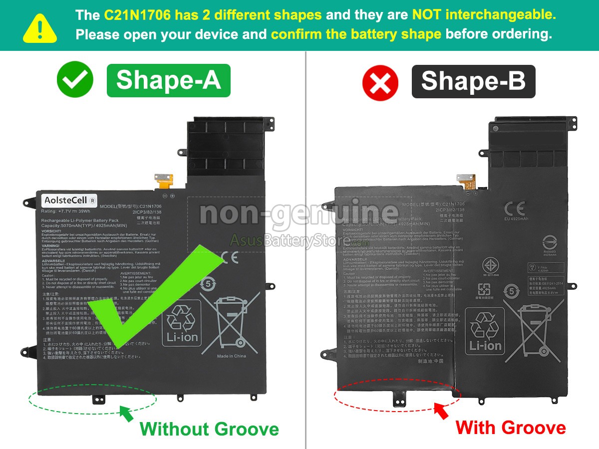 The shell of our Asus C21N1706(2ICP3/82/138) battery adopts the identical design as the original battery to guarantee 100% compatibility with your laptop. In addition, our technicians also conduct a series of strict quality inspections and safety tests on the batteries to ensure that the batteries you receive are brand new, in good condition, and reliable in quality.